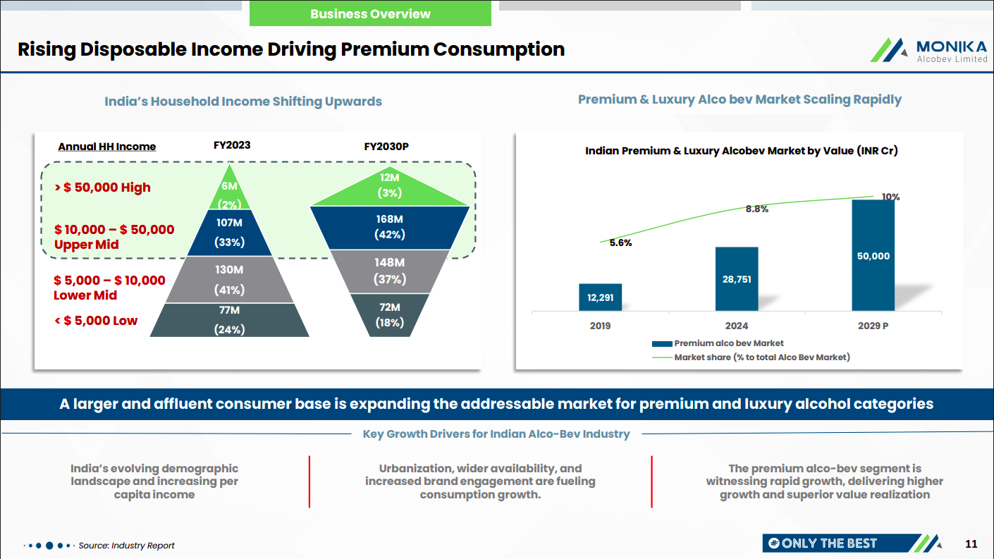 India’s upward income mobility is expanding the upper-middle and high-income segments, increasing the addressable base for premium and luxury alco-bev products. The premium segment is scaling rapidly, with market value projected to nearly double by 2029.