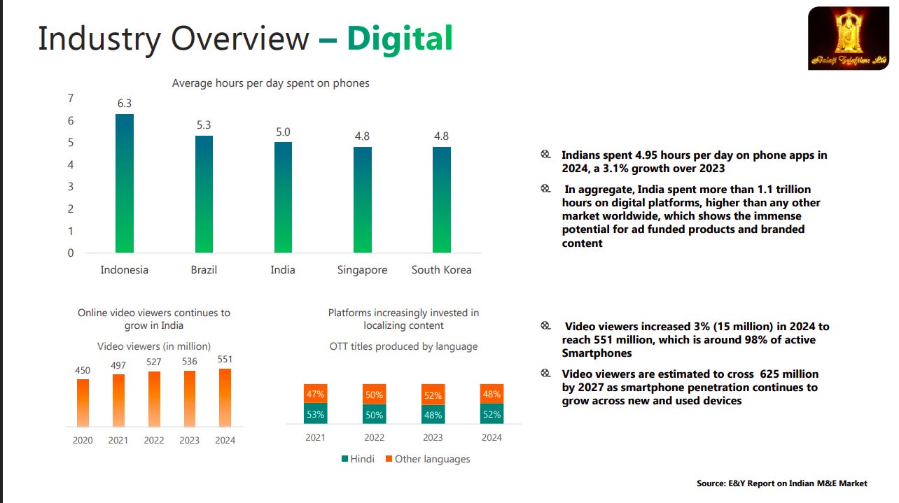 Indians spent 4.95 hours per day on phone apps in 2024, with digital video viewers rising to 551 million and expected to cross 625 million by 2027. India leads globally in total digital hours spent, highlighting strong monetization potential for OTT and branded content.