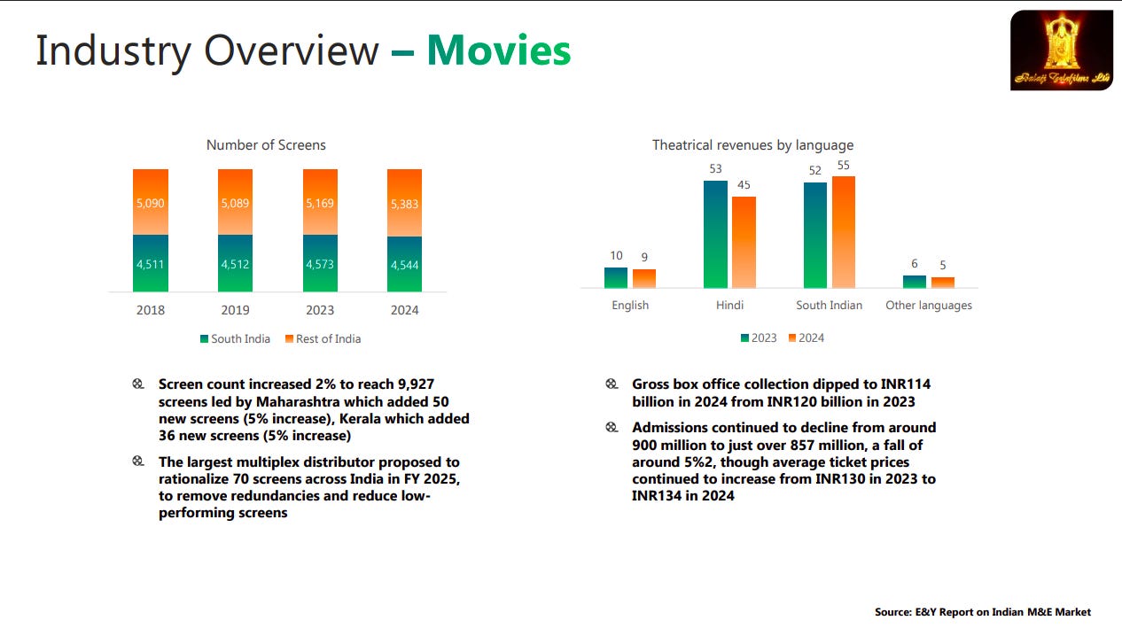 India’s screen count rose 2% to 9,927 in 2024, though box office collections dipped to ₹114 billion amid a 5% drop in admissions. Despite lower footfalls, average ticket prices increased, and rationalization of screens is expected in FY25 to improve efficiencies.