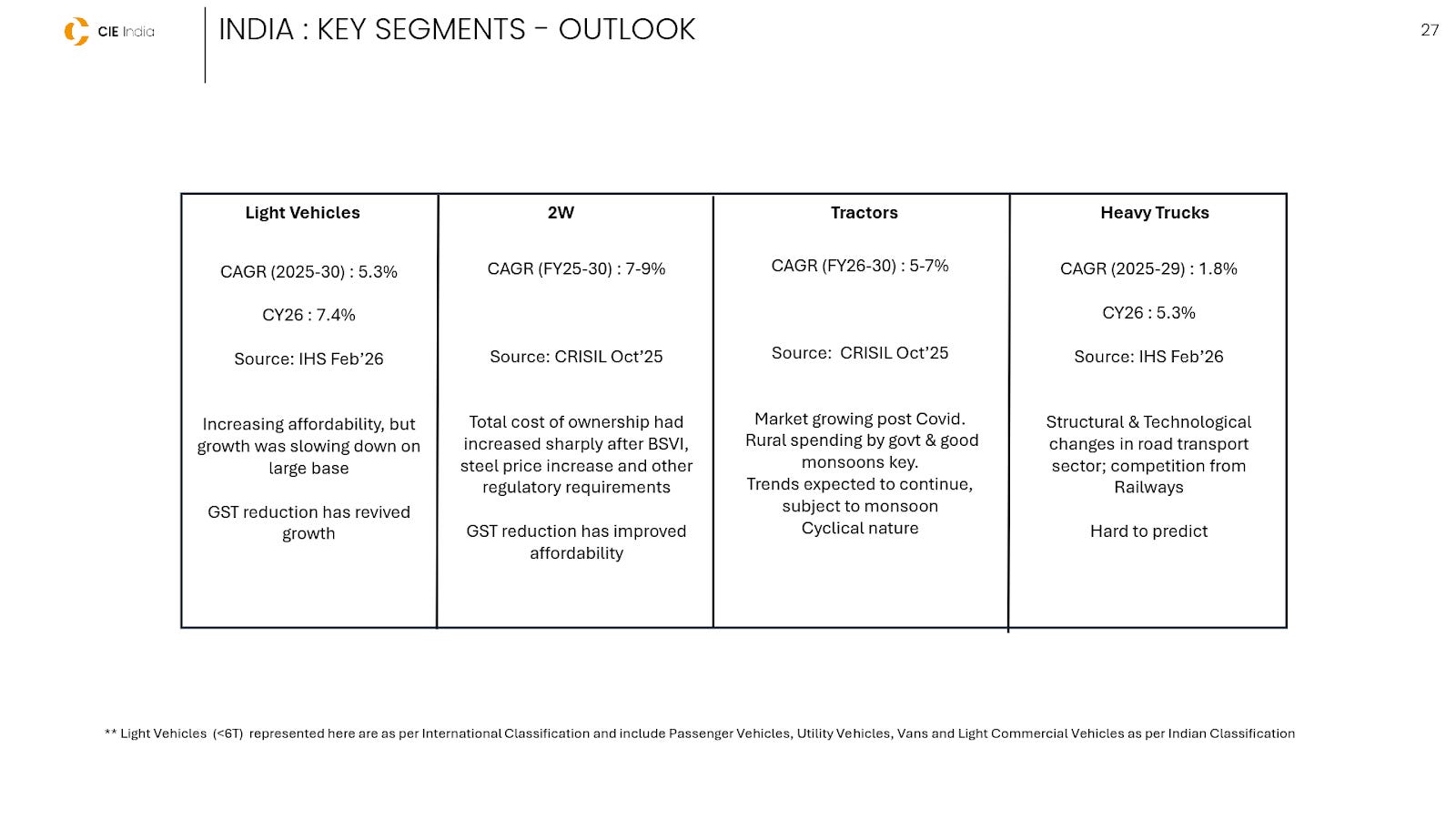 Long-term projections favor the two-wheeler segment with 7-9% growth, while the heavy truck market is expected to face structural stagnation due to rail competition. This shift in the internal product mix will require realigning manufacturing capacity to maintain margin stability over the next five years.