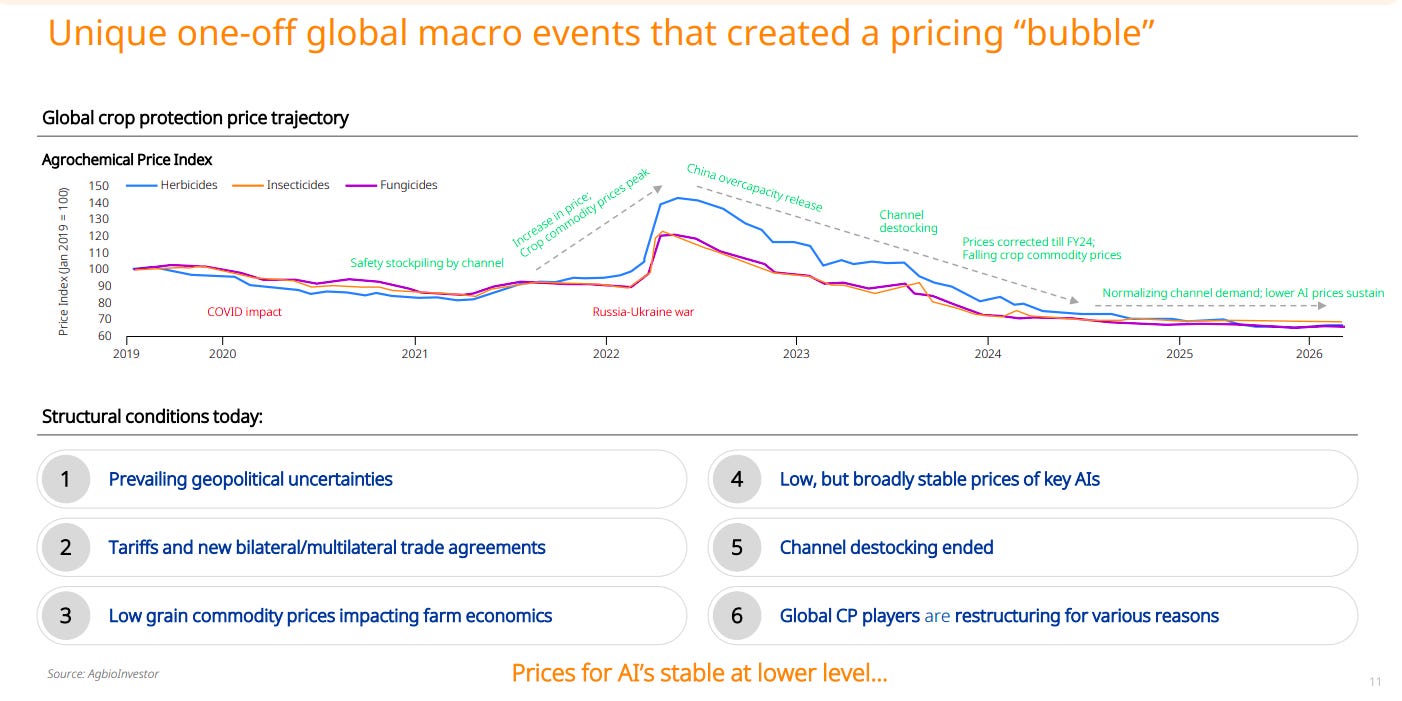 Agrochemical prices spiked due to COVID disruptions, supply chain issues, and the Russia-Ukraine war, creating a temporary pricing bubble. Prices have since corrected and stabilized at lower levels, with channel destocking largely complete and structural reset underway.
