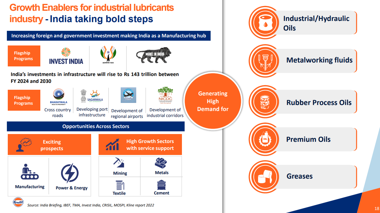 India’s infrastructure investments are expected to hit ₹143 trillion between FY24 and FY30, with flagship programs like Bharatmala, Sagarmala, UDAN, and industrial corridors driving activity. All of this is generating high demand for industrial lubricants across categories like hydraulic oils, metalworking fluids, premium oils, and greases. Sectors like manufacturing, power & energy, mining, metals, textile, and cement add further tailwinds.