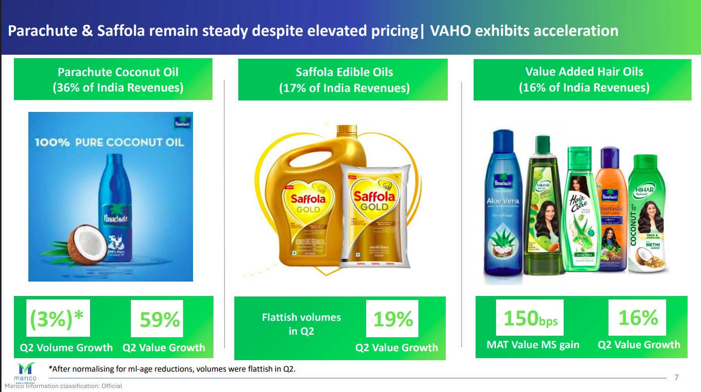 Parachute posted flattish volumes but strong value growth due to pricing, while Saffola saw stable volumes and 19% value growth. Value-Added Hair Oils accelerated with 16% value growth and steady market share gains.