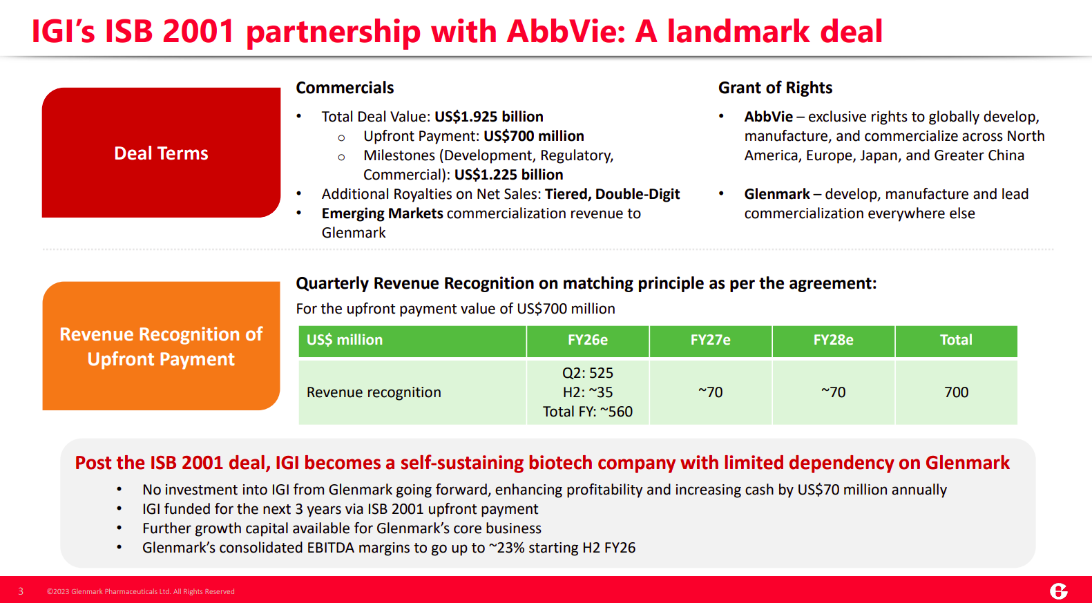 Glenmark has finally unlocked value from its long-loss-making biotech subsidiary — striking a $1.9 billion licensing deal with AbbVie for its cancer asset ISB 2001. The hefty $700 million upfront turns Ichnos Glenmark Immuno-oncology (IGI) into a self-funded business, lifts group margins, and gives Glenmark a clean runway without needing to bankroll biotech losses anymore.