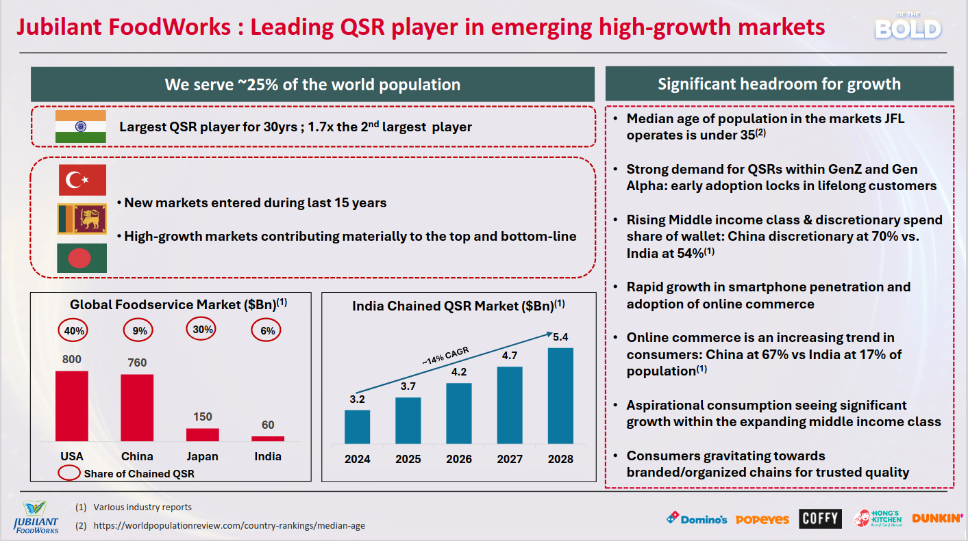 Jubilant FoodWorks operates across India, Turkey, Sri Lanka and Bangladesh, reaching markets that serve ~25% of the world’s population. With a young demographic, rising discretionary spending and rapid digital adoption, the QSR opportunity continues to grow, supported by India’s ~14% CAGR chained QSR market trajectory.