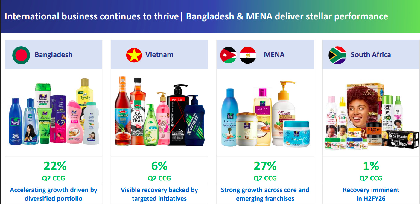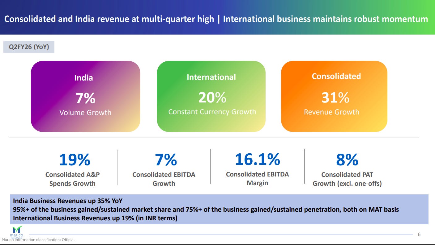 Consolidated revenue grew 31% YoY, led by 20% constant-currency growth in international markets and 7% volume growth in India. EBITDA margin held strong at 16.1%, with 8% PAT growth despite increased A&P spends.