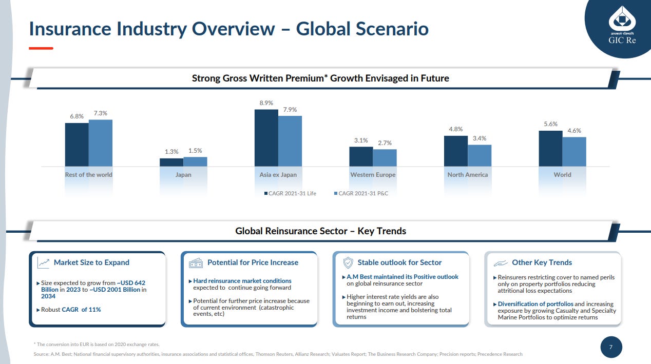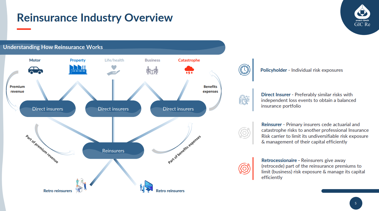 General Insurance Corporation of India is the sole reinsurer in the domestic market, providing reinsurance across various business lines including property, marine, motor, and life insurance. It leads treaty programmes and facultative placements for domestic companies, and is expanding its presence in the Afro-Asian region by leading reinsurance programs for insurance companies in SAARC countries, South East Asia, Middle East, and Africa.