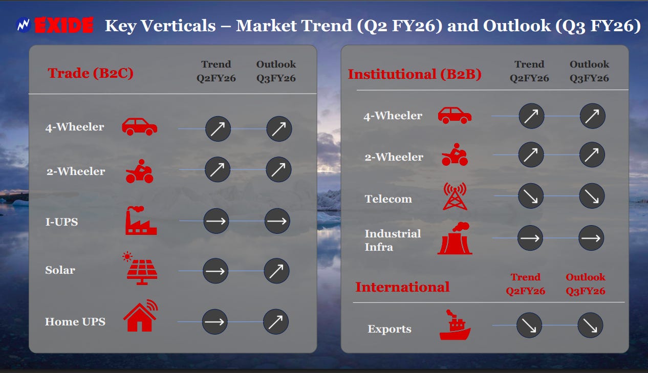 B2C and B2B segments show broad-based strength, with 4W/2W, Solar, Home UPS, and most institutional categories trending upward in Q2 and expected to stay strong in Q3. Only Exports remain weak with a declining trend expected to persist. Overall, domestic demand momentum continues to improve across verticals.