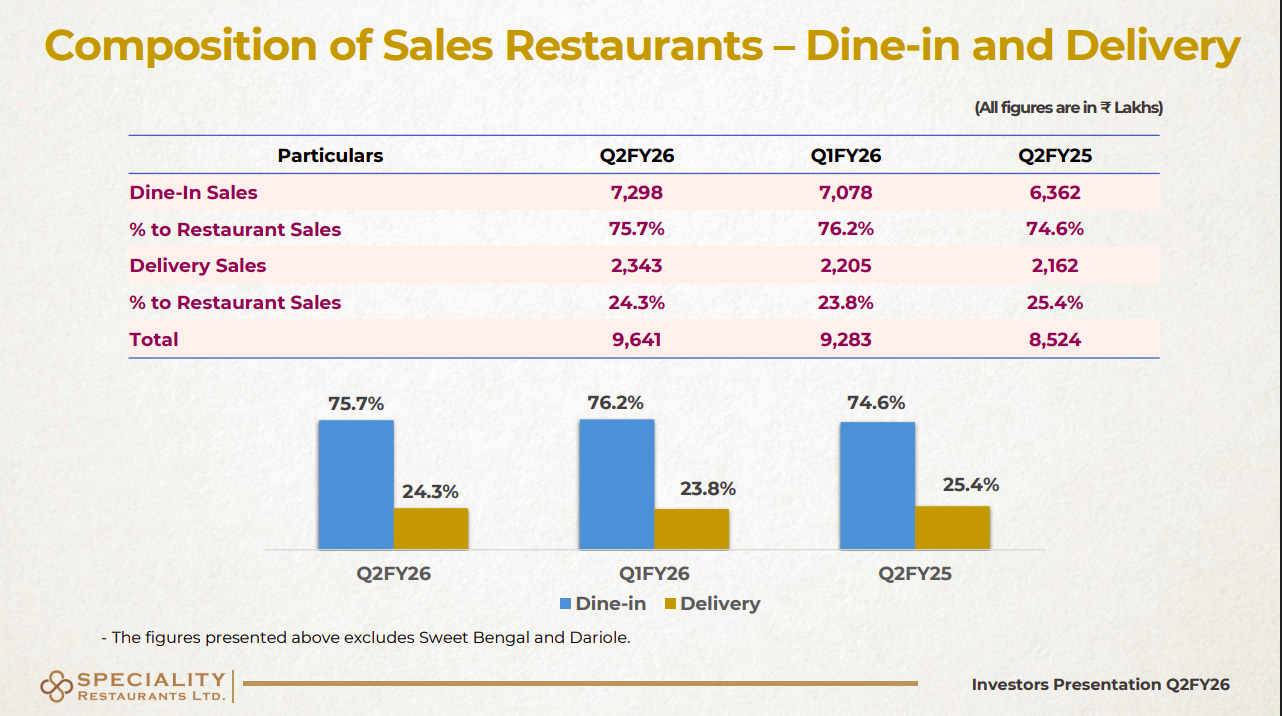 Dine-in remains the dominant channel, contributing ~76% of restaurant sales, with steady improvement YoY. Delivery continues to hold a stable 24% share, supported by consistent demand. Overall restaurant revenue rose to ₹9,641 lakhs in Q2FY26 vs ₹8,524 lakhs last year.