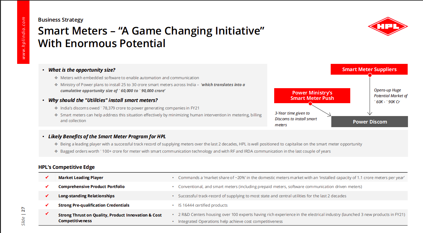 India’s aggressive smart-meter rollout (25–30 crore meters; ₹60,000–90,000 crore opportunity) creates a massive multi-year demand pool for players like HPL. With strong credentials, long-standing utility relationships, and proven smart-communication technology, HPL is well placed to win orders and gain from utilities’ push to reduce losses and improve billing efficiency.