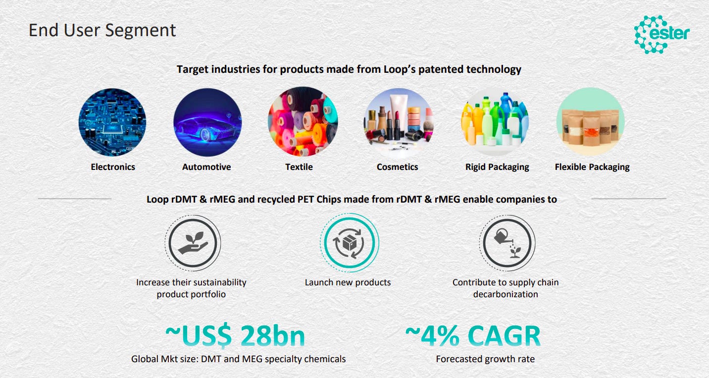 Products made using Loop’s recycled rDMT & rMEG target diverse industries like electronics, automotive, textiles, cosmetics, and packaging. These help companies launch sustainable products and meet decarbonization goals. Global DMT/MEG specialty chemical market is ~US$28 bn, growing at ~4% CAGR.