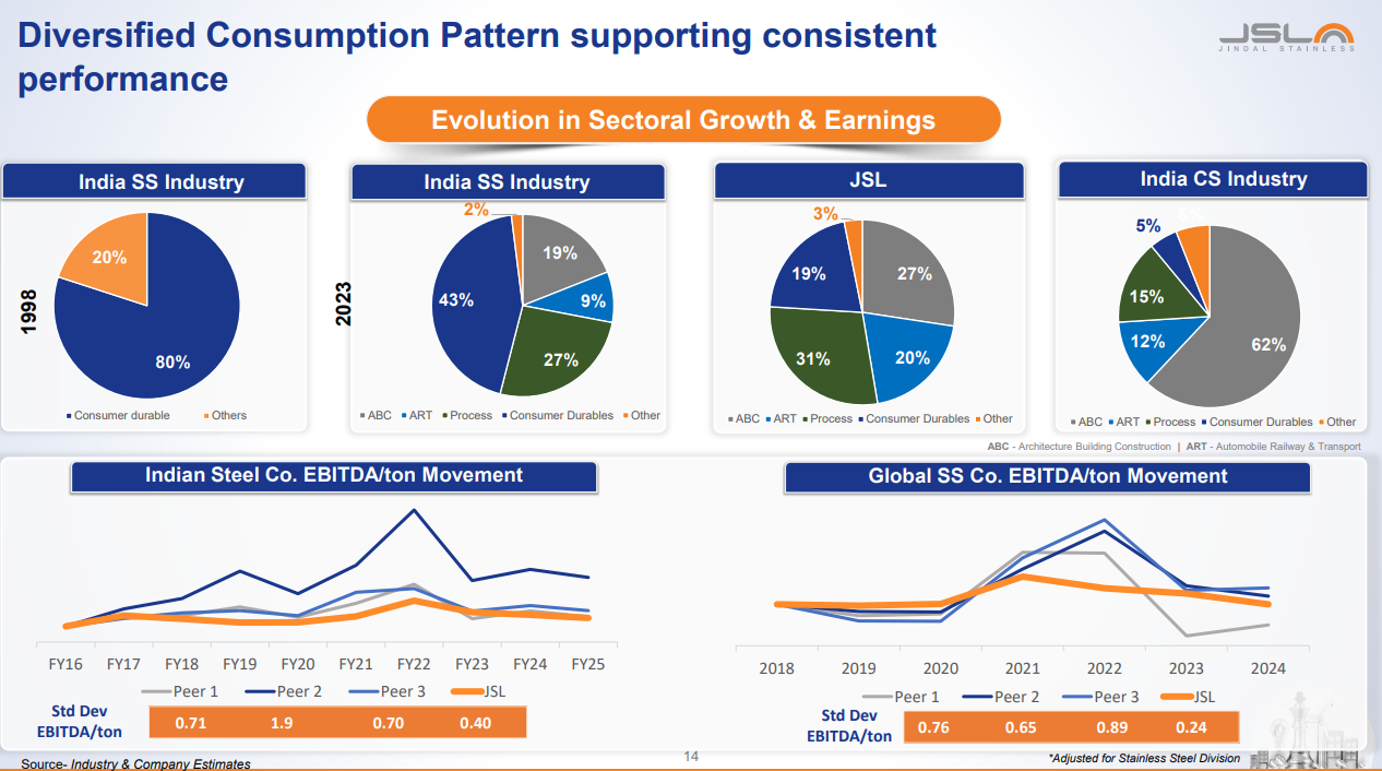 JSL has evolved from heavy dependence on consumer durables (80% in 1998) to a well-diversified portfolio by 2023. The company’s sectoral mix—27% Architecture Building Construction, 31% Process, 20% Auto Railway Transport, 19% Consumer Durables, and 3% Others—contrasts sharply with both the broader Indian stainless steel industry and carbon steel industry. This diversification has delivered more consistent earnings, with JSL showing the lowest EBITDA/ton volatility (standard deviation of 0.40) compared to Indian steel peers (0.71-1.9) and global stainless steel companies (0.24-0.89).