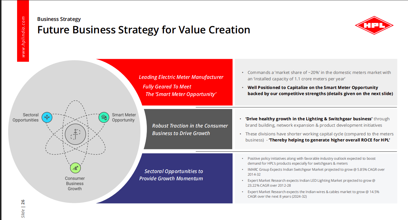 HPL plans to drive value through three engines: leveraging its leadership in electric meters to capture the large smart-meter opportunity, accelerating growth in consumer-facing lighting & switchgear, and tapping sectoral tailwinds across wires, cables, and LED lighting. Strong market share, supportive policy, and faster-working-capital consumer divisions position the company for sustained ROCE improvement.