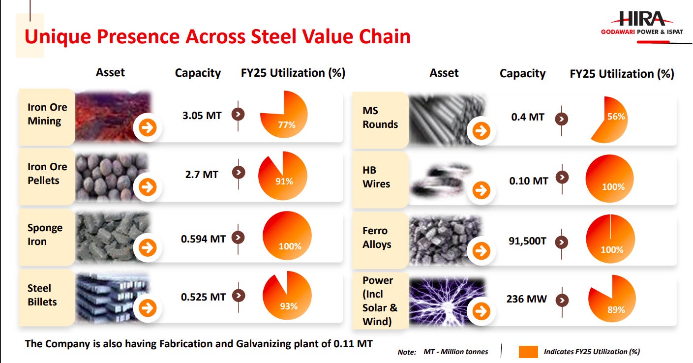 Hira operates across the full steel value chain — from iron ore mining and pellets to sponge iron, billets, ferro alloys, HB wires, MS rounds, and captive power — ensuring strong raw-material security and margin stability. FY25 utilisation levels are high (77–100%), reflecting strong demand, operational efficiency, and integrated cost advantages.