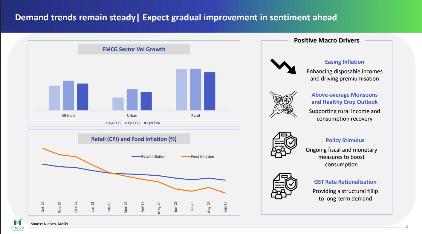 FMCG sector volumes remain steady across urban and rural markets, supported by easing inflation and softer food prices. Better monsoons, policy support, and GST rate rationalisation are expected to further lift consumption.