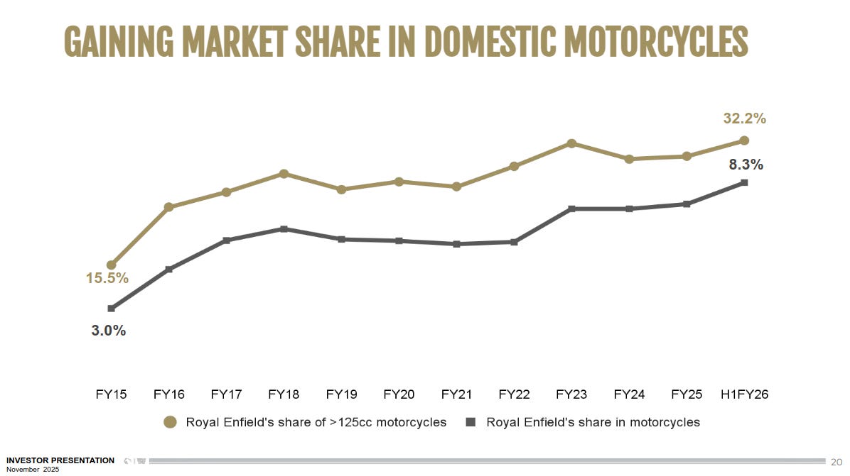 Royal Enfield has steadily expanded its share in the >125cc motorcycle segment from ~15% in FY15 to over 32% in H1 FY26. Its overall motorcycle market share has also climbed to 8.3%, reflecting strong brand pull and rising penetration in premium categories.