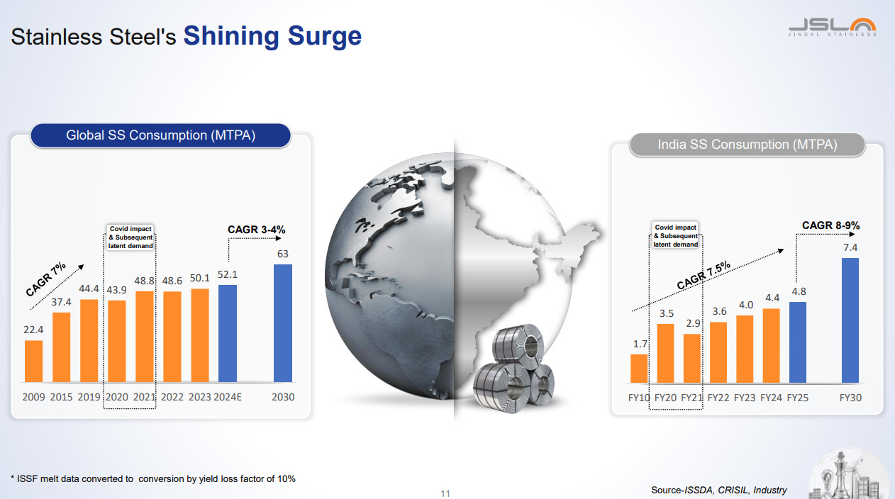 Global stainless steel consumption has grown from 22.4 million tonnes in 2009 to 52.1 million tonnes in 2024, with projections reaching 63 million tonnes by 2030. India’s consumption trajectory shows even stronger momentum, growing from 1.7 million tonnes in FY10 to 4.8 million tonnes in FY25, and expected to reach 7.4 million tonnes by FY30. Both markets experienced COVID-related disruptions followed by subsequent recovery and latent demand, with India demonstrating particularly robust growth rates of 8-9% CAGR.