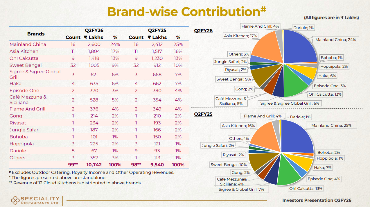 Mainland China, Asia Kitchen, and Oh! Calcutta continue to drive the bulk of revenues, contributing over 50% of Q2FY26 sales. The revenue mix remains broadly stable YoY, with only minor shifts across smaller brands. Total brand-level revenue rose to ₹107.42 crores from ₹95.40 crores last year.