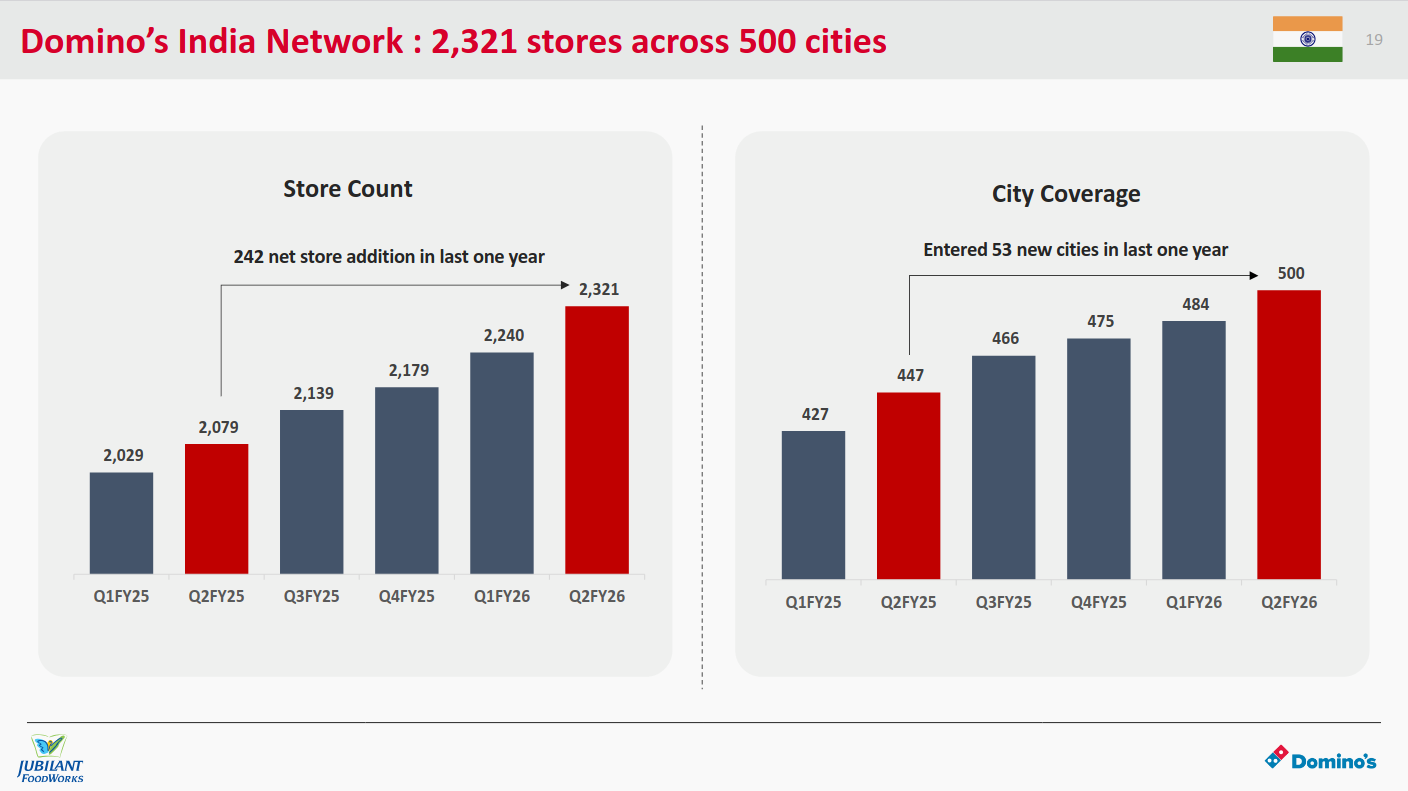 Domino’s expanded aggressively in FY26, adding 242 net new stores to reach 2,321 outlets across India. City presence rose from 447 to 500 cities, with 53 new cities entered in the last year, signalling strong geographic expansion.