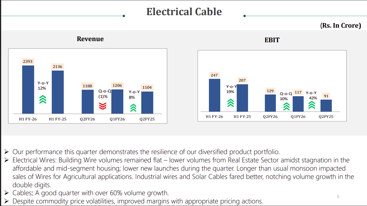 Electrical Cable revenue grew 12% YoY to ₹2,393 crore in H1 FY26, with EBIT up 19% YoY to ₹247 crore. Strong performance in industrial and solar cables offset weakness in real estate-linked building wires, aided by better pricing and over 60% volume growth in cables.