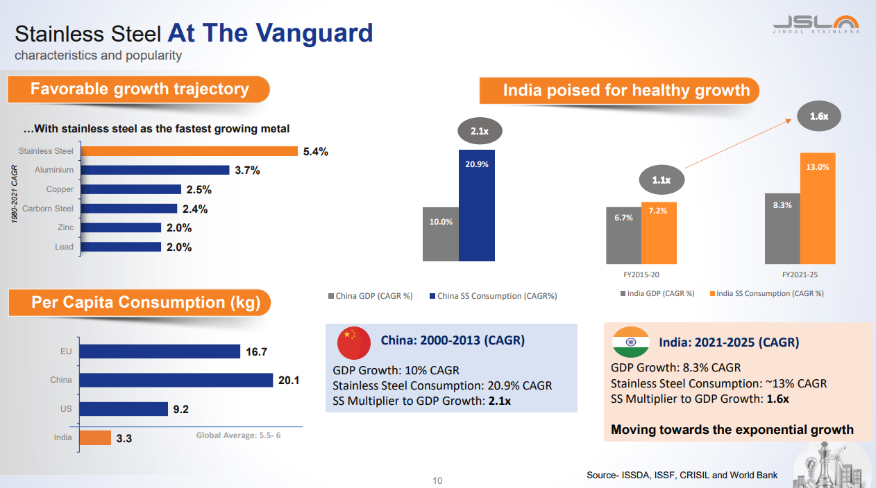 Stainless steel is emerging as the fastest-growing metal, expanding at 5.4% CAGR compared to other metals like aluminium and copper. India’s stainless steel consumption is set for healthy growth, with a 1.6x multiplier to GDP growth between FY21-25. The country is following a similar trajectory to China’s exponential growth phase, where stainless steel consumption grew 2.1 times faster than GDP. With India’s per capita consumption at just 3.3 kg compared to the global average of 5.5-6 kg, there’s significant room for expansion as the economy develops.