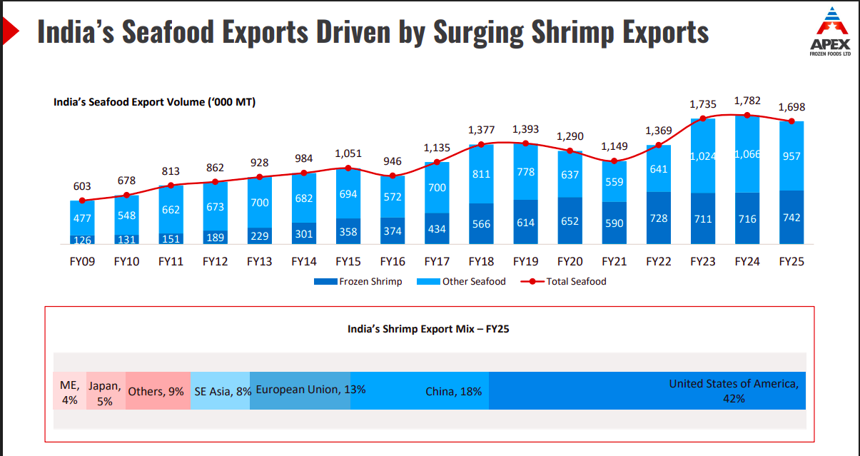 India’s seafood exports have grown consistently over the past decade, with frozen shrimp emerging as the dominant contributor. In FY25, the U.S. accounted for 42% of shrimp exports, followed by China and the EU, highlighting India’s strong reliance on key global markets.