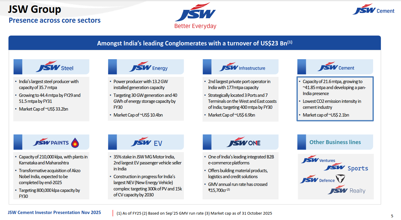 JSW Group spans steel, energy, infrastructure, cement, paints, EVs and digital B2B platforms, with a combined turnover of US$23 billion. The group is scaling aggressively across sectors—from renewable power and ports to EV manufacturing and e-commerce—strengthening its integrated industrial ecosystem.