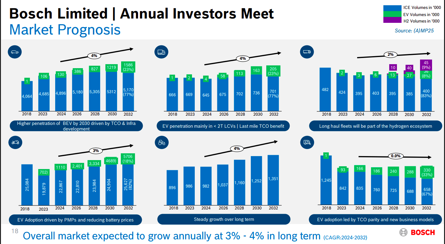 The slide shows steady long-term market growth of 3–4% CAGR (2024–2032) across autos, driven by rising EV penetration in passenger cars, LCVs, and two-wheelers. Hydrogen adoption gains traction in long-haul fleets, while EV momentum is supported by TCO benefits, PMP schemes, and falling battery prices.