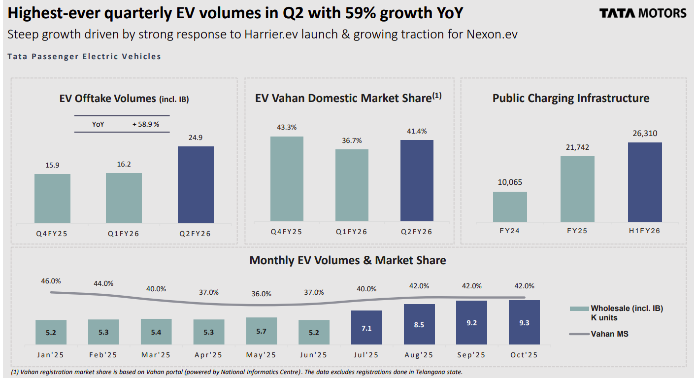 Tata Motors posted its highest-ever quarterly EV offtake at 24.9K units (+59% YoY), driven by new launches and accelerating demand. EV Vahan market share rose to 41.4% in Q2, while public charging infrastructure expanded rapidly to 26,310 points, supporting sustained EV momentum.