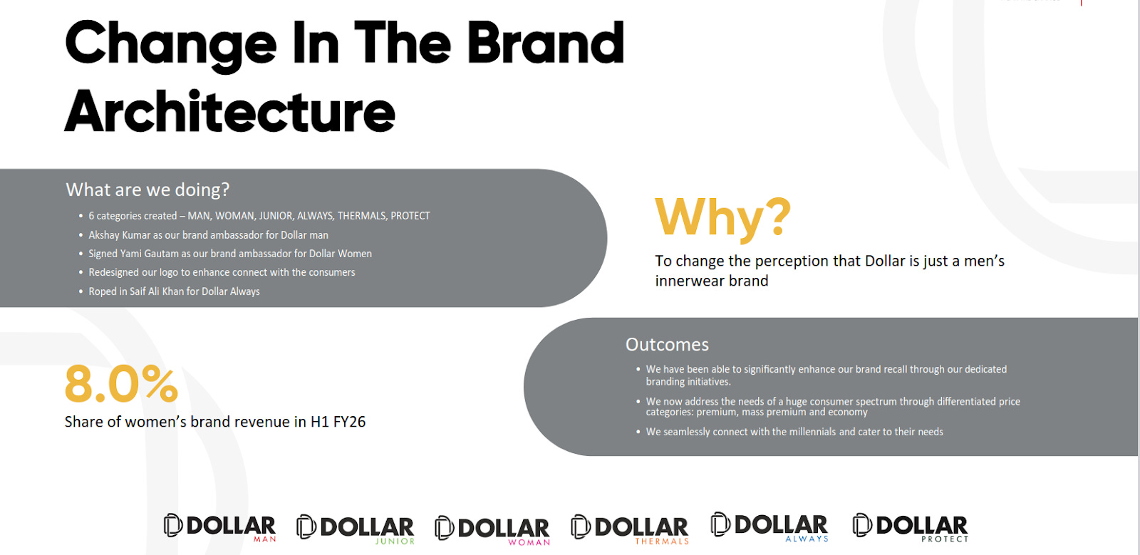 Dollar is repositioning itself with six new category identities, refreshed logos, and celebrity endorsements to broaden appeal beyond men’s innerwear. Early results show improved brand recall and better alignment with diverse consumer segments, though women’s wear still contributes only 8%.