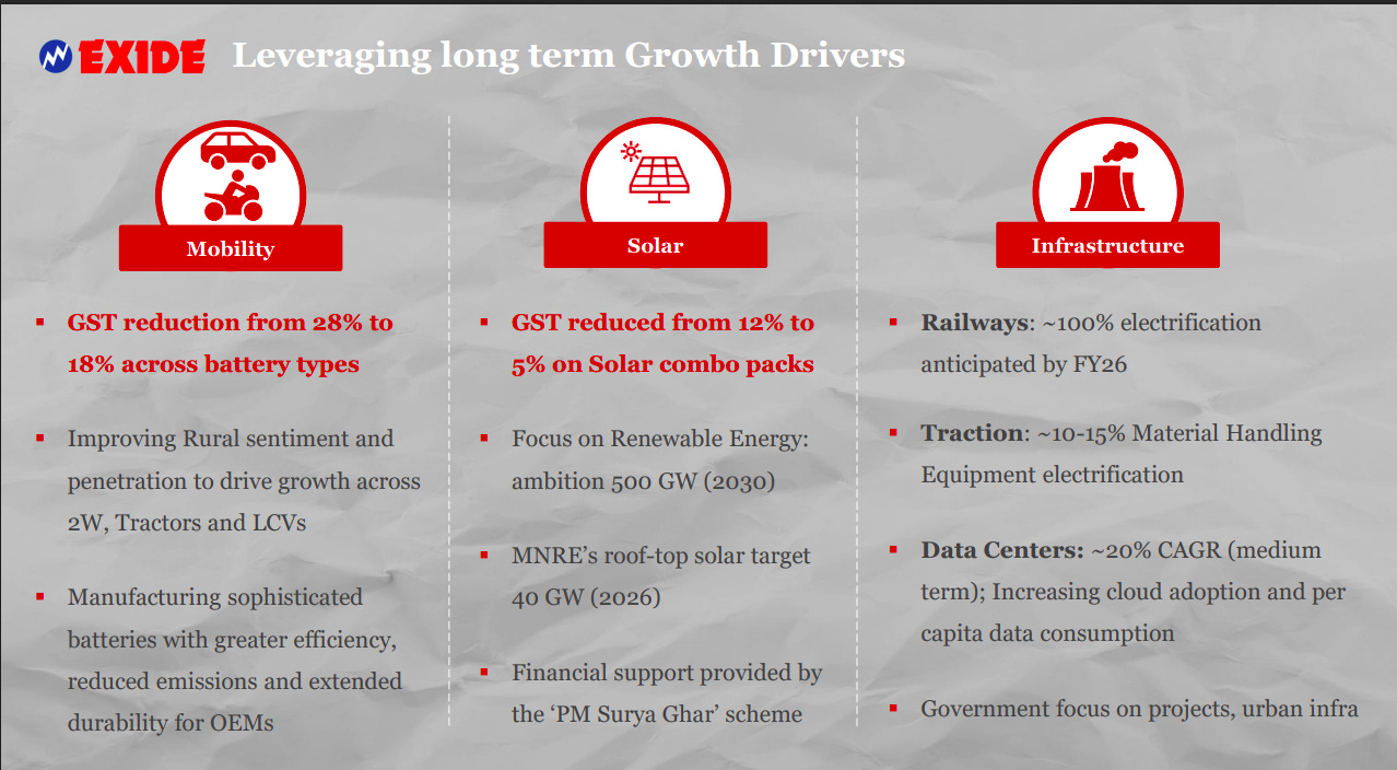 Long-term growth is supported by GST cuts, rising rural demand, and electrification across mobility. Solar expansion, government-backed schemes, and major infrastructure pushes—especially railways, traction, and data centers—are expected to structurally lift battery demand. These factors collectively strengthen Exide’s multi-vertical demand outlook.