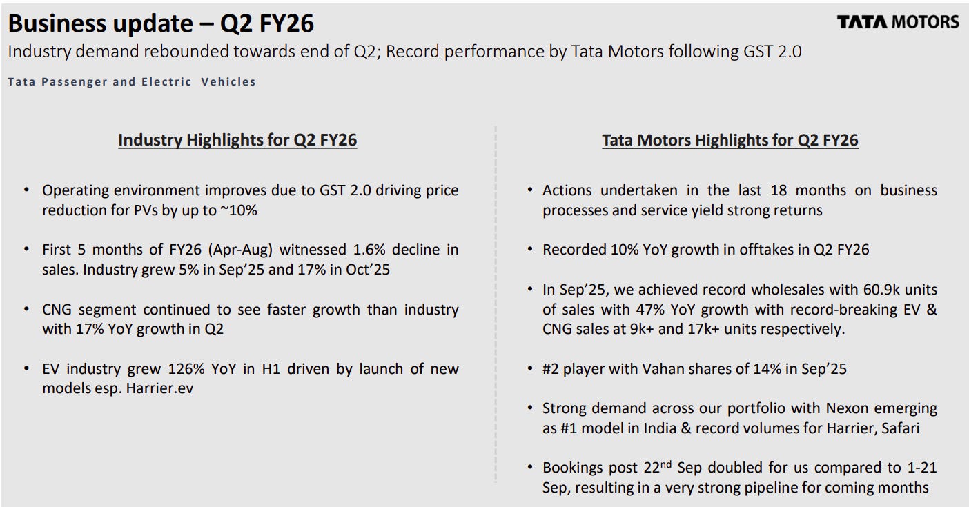 Industry demand recovered sharply toward the end of Q2, aided by GST 2.0 price cuts, improving sentiment, and strong CNG and EV growth. Tata Motors delivered a standout quarter with 10% YoY wholesales growth, record EV/CNG volumes, and strong traction across Nexon, Harrier.ev, and Safari, supported by a robust bookings pipeline.