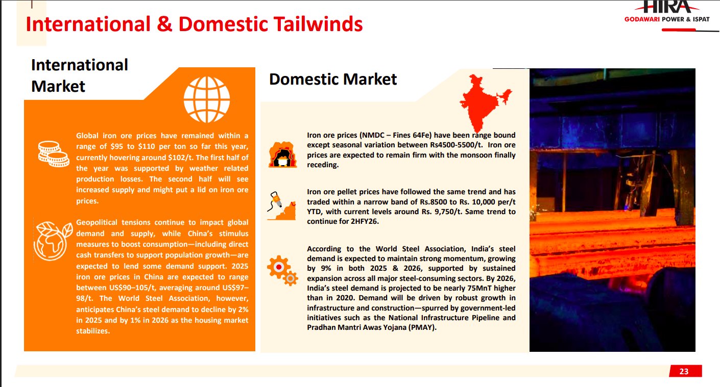 Global iron ore prices have stayed stable in the $95–$110/t band, while China’s muted demand outlook is partly offset by stimulus measures. In India, ore and pellet prices remain stable, and steel demand is projected to grow 9% in both 2025 and 2026, supported by infrastructure, construction, and government-led capex programmes.