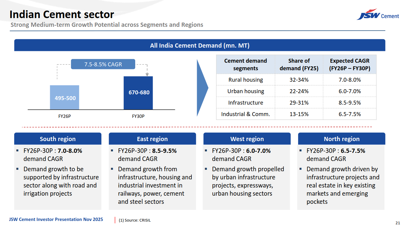 India’s cement demand is expected to grow at 7.5–8.5% CAGR from FY26 to FY30, rising from ~500 MT to ~670–680 MT. Growth is broad-based across rural housing, urban housing, infrastructure, and industrial segments, with the East and South regions leading demand expansion.