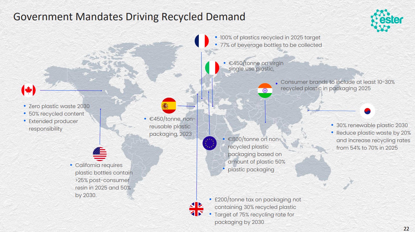 Countries globally are pushing aggressive recycling targets—EU taxes on virgin plastic, UK’s recycled-content tax, US/Canada mandates for post-consumer resin, and India’s 10–30% recycled packaging norms. These policies are accelerating demand for recycled plastics worldwide.