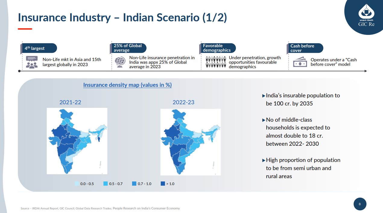 India ranks 4th in Asia and 15th globally for non-life insurance, but penetration remains just 25% of the global average. Heat maps show insurance density varies widely across Indian states between 2021-22 and 2022-23. The demographic tailwinds are strong: India’s insurable population will reach 100 crore by 2035, middle-class households will nearly double to 18 crore between 2022-2030, and much growth will come from semi-urban and rural areas. India operates on a “cash before cover” model.