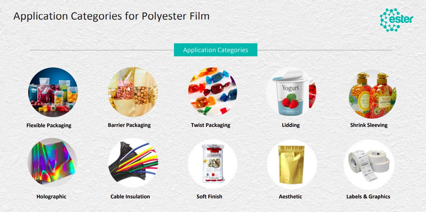 Polyester films serve a wide range of packaging-led applications—flexible packs, barrier films, twist wraps, lidding, shrink sleeves, holographics, cable insulation, soft-finish films, aesthetics, and labels. The versatility comes from durability, printability, and high-barrier properties.