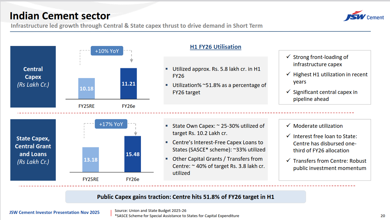 Central and state capex momentum is strong, with H1 FY26 utilisation at ~52%, the highest in recent years. Robust front-loading of capex, interest-free loans to states and strong infrastructure spending continue to support near-term cement demand.