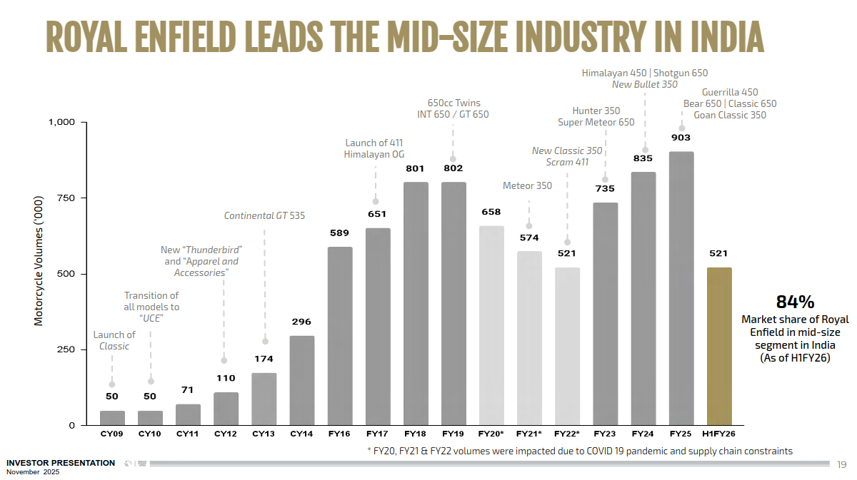 Royal Enfield continues to dominate India’s mid-size motorcycle segment with an 84% market share, supported by a strong product pipeline and consistent new model launches. Despite COVID-era disruptions, volumes have recovered sharply, touching 903k units in FY25 before normalizing in H1 FY26.