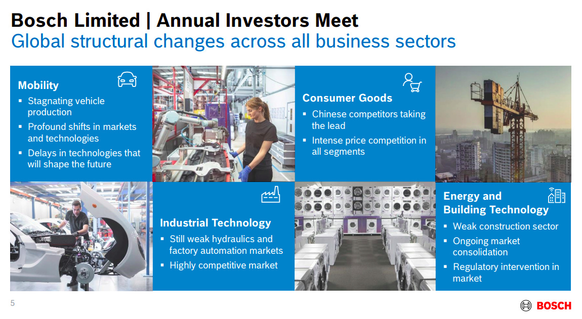 Bosch highlights broad structural shifts: mobility faces stagnation and delayed tech transitions; consumer goods are pressured by aggressive Chinese competition; industrial technology remains weak and highly competitive; and energy/building tech struggles with a soft construction cycle, consolidation, and regulatory pressures.
