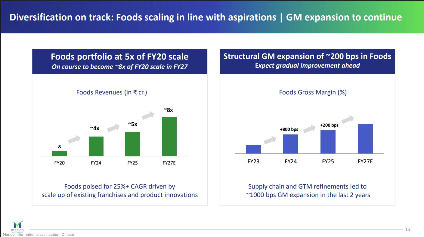 Marico’s Foods segment has grown ~5x since FY20 and is on track for ~8x scale by FY27. Structural gross margin expansion (~1000 bps already achieved) is expected to continue with another ~200 bps improvement ahead.