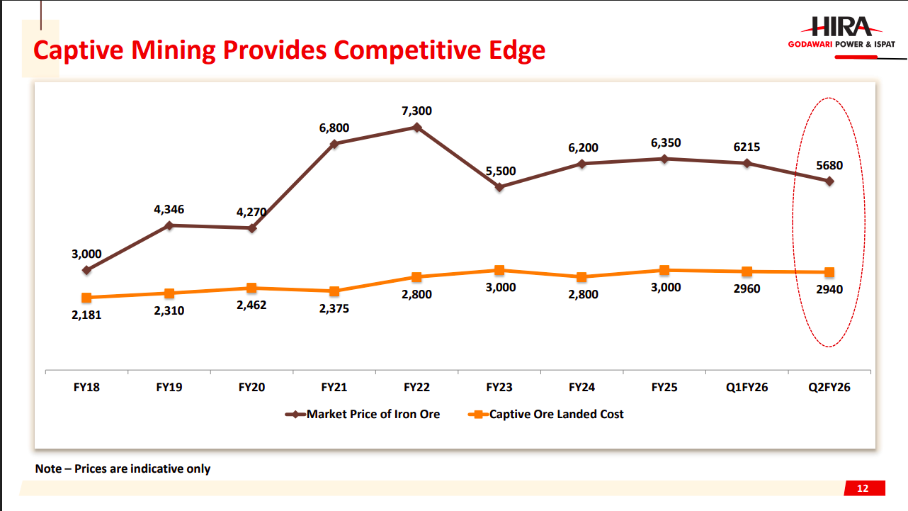 Hira’s captive ore cost has remained steady at ~₹2,200–3,000/t over the last several years, significantly below volatile market ore prices. This long-term cost arbitrage provides a strong competitive edge, protects margins during commodity cycles, and ensures consistent profitability versus non-integrated peers.