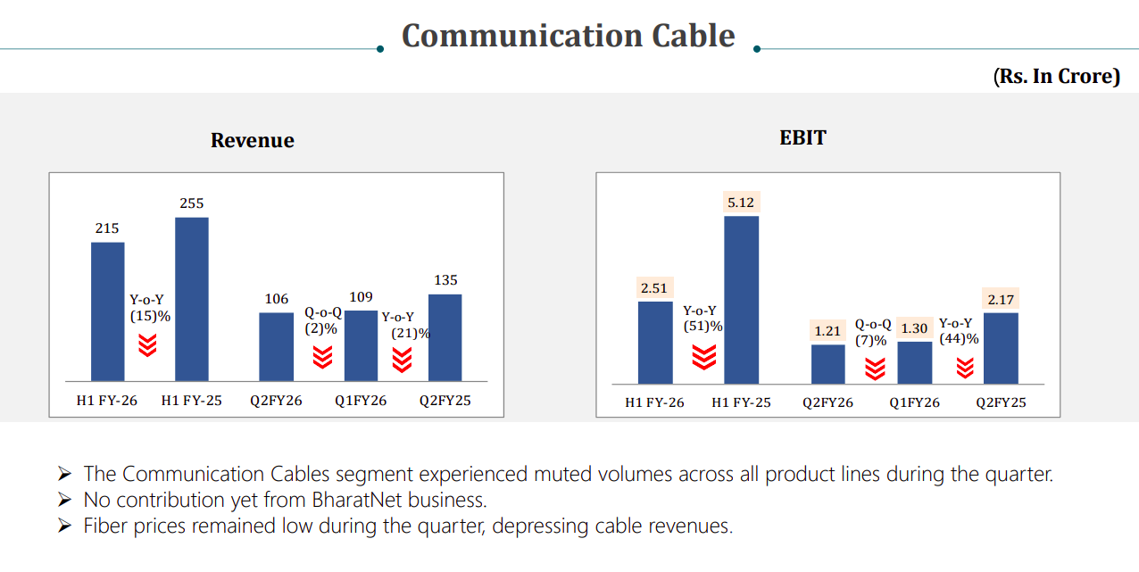 Communication Cable revenue declined 15% YoY to ₹215 crore, with EBIT dropping 51% YoY due to muted volumes and persistently low fiber prices. The segment saw no contribution from BharatNet projects, which continues to weigh on growth.