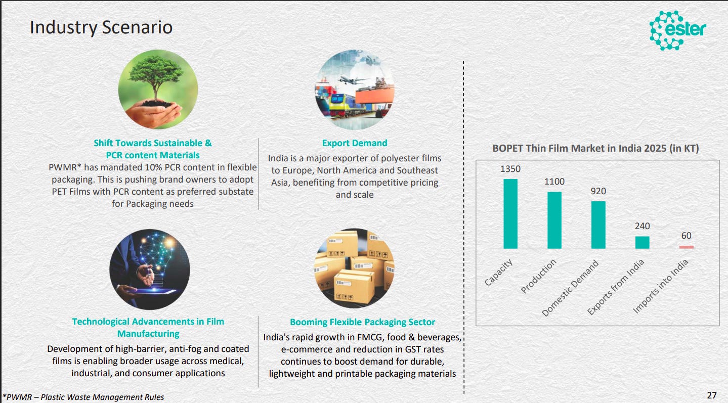 Ester Industries is a manufacturer of polyester films, specialty polymers, and engineering plastics. The company produces these materials for various sectors, including flexible packaging, textiles, and electronics. Its products are used in applications like food packaging, industrial packaging, and lidding for products like dairy and juices.