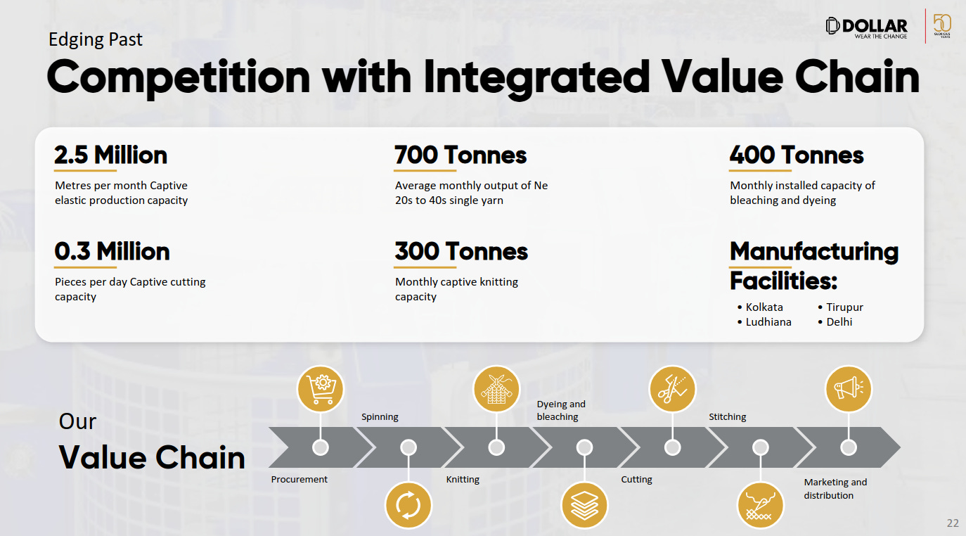 Dollar highlights a strong end-to-end integrated value chain with captive capacity across spinning, knitting, dyeing, cutting, and stitching, enabling scale, cost efficiency, and quality control. Manufacturing facilities across Kolkata, Ludhiana, Tirupur, and Delhi further strengthen execution and competitiveness.Dollar highlights a strong end-to-end integrated value chain with captive capacity across spinning, knitting, dyeing, cutting, and stitching, enabling scale, cost efficiency, and quality control. Manufacturing facilities across Kolkata, Ludhiana, Tirupur, and Delhi further strengthen execution and competitiveness.