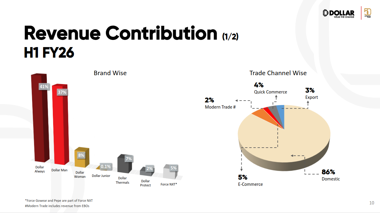 Dollar’s revenue is heavily concentrated in two brands—Dollar Always (41%) and Dollar Man (37%), with smaller contributions from Women, Thermals, and Force NXT. On the channel side, Domestic trade dominates at 86%, while e-commerce, modern trade, exports, and quick commerce remain small but emerging streams.