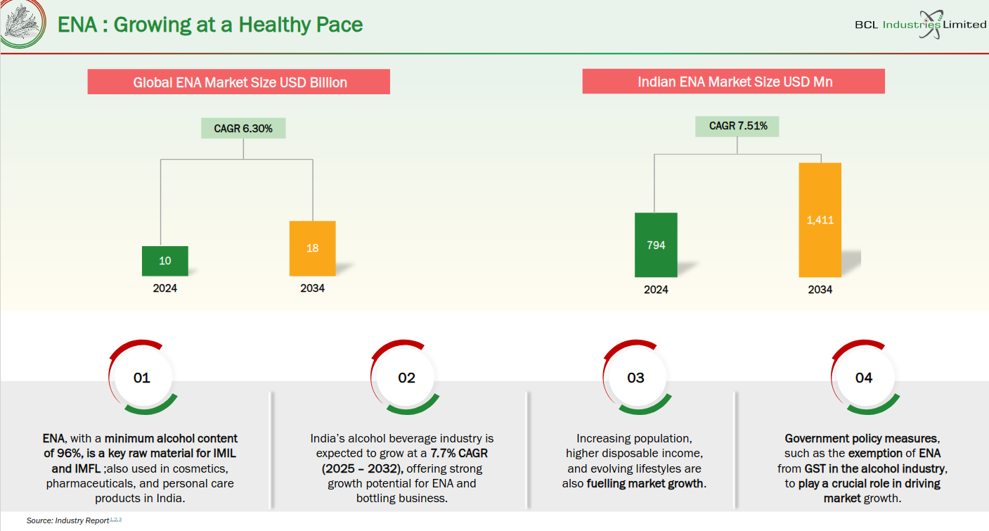 The global ENA market is set to grow from USD 10B (2024) to USD 18B (2034), while India’s ENA market expands from USD 794M to USD 1.4B, supported by rising alcohol consumption, higher disposable incomes and stronger policy incentives. ENA remains a key raw material for IMFL/IMIL, cosmetics and pharma, benefiting from structural long-term demand.